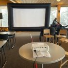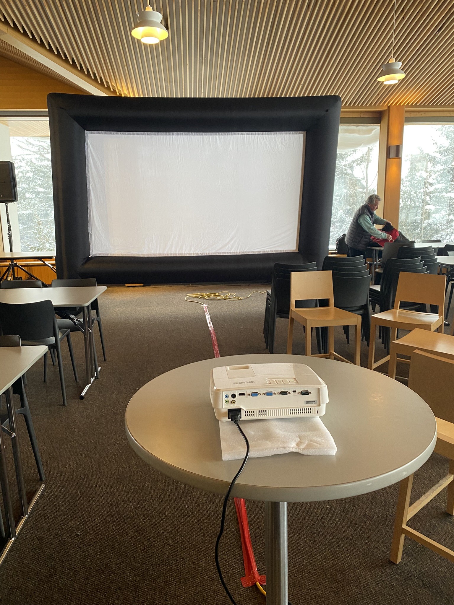 Comes with, screen and blower, projector, sound system, and cords to hook your device up to the projector.