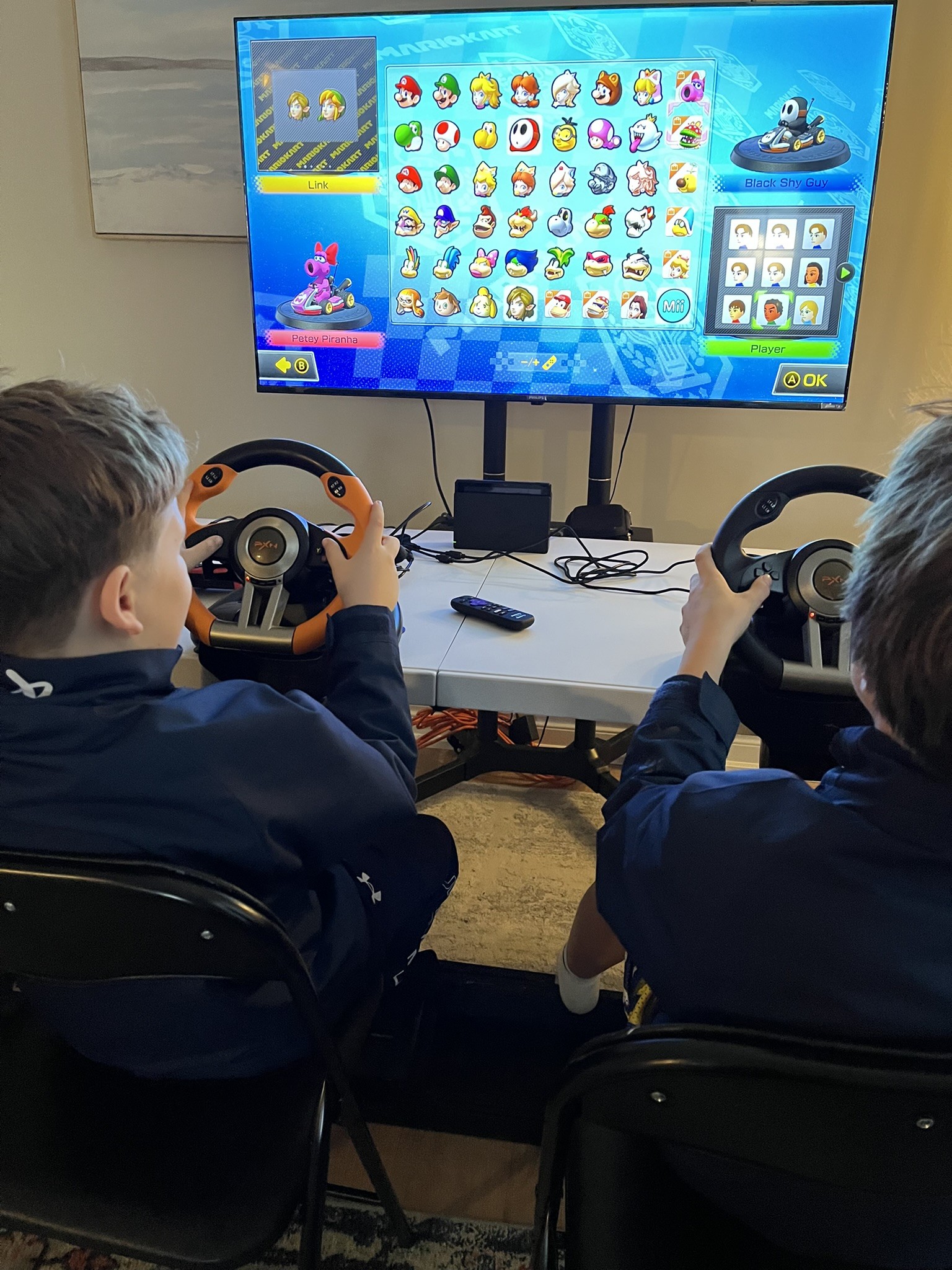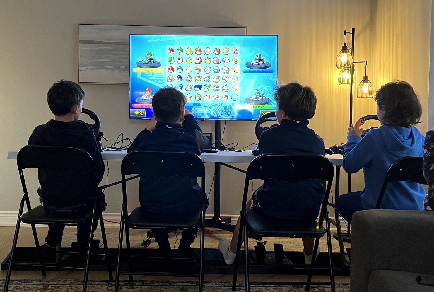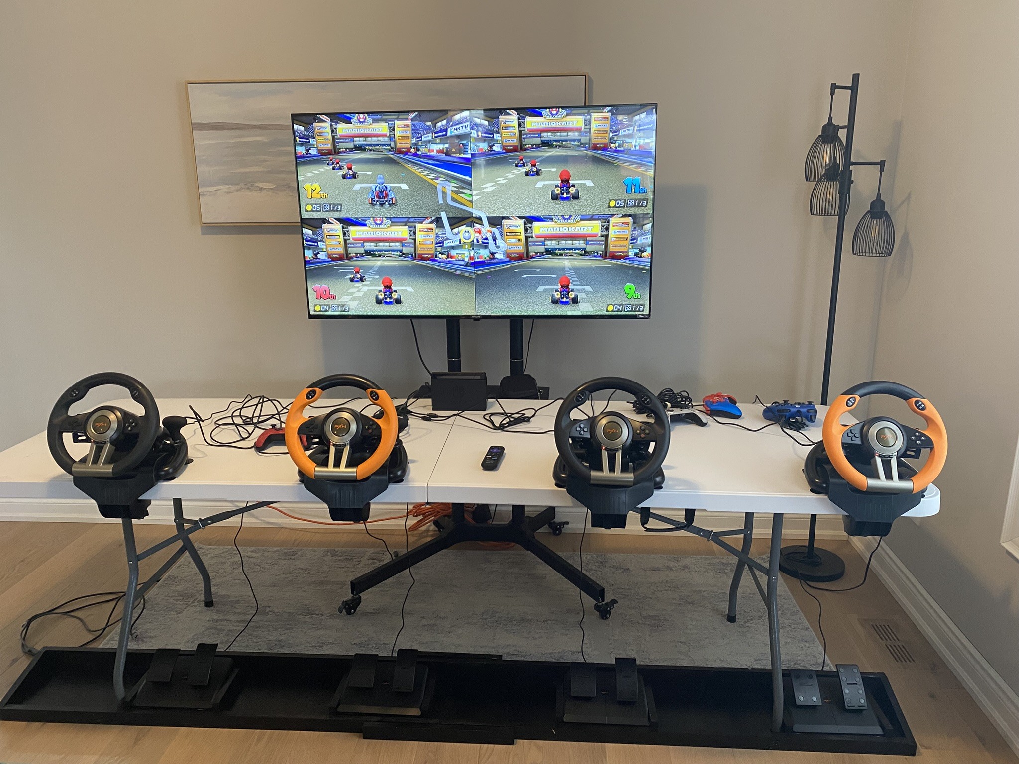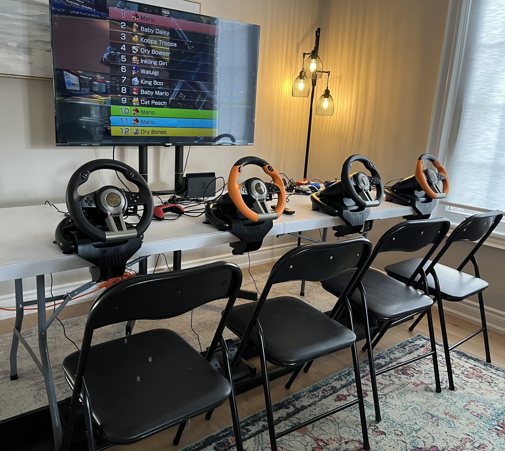 4 Players with all your favourite characters to choose from.  Comes with 55″ Screen TV with stand, Nintendo Switch, 4 steering wheels and pedals, table and 4 chairs.