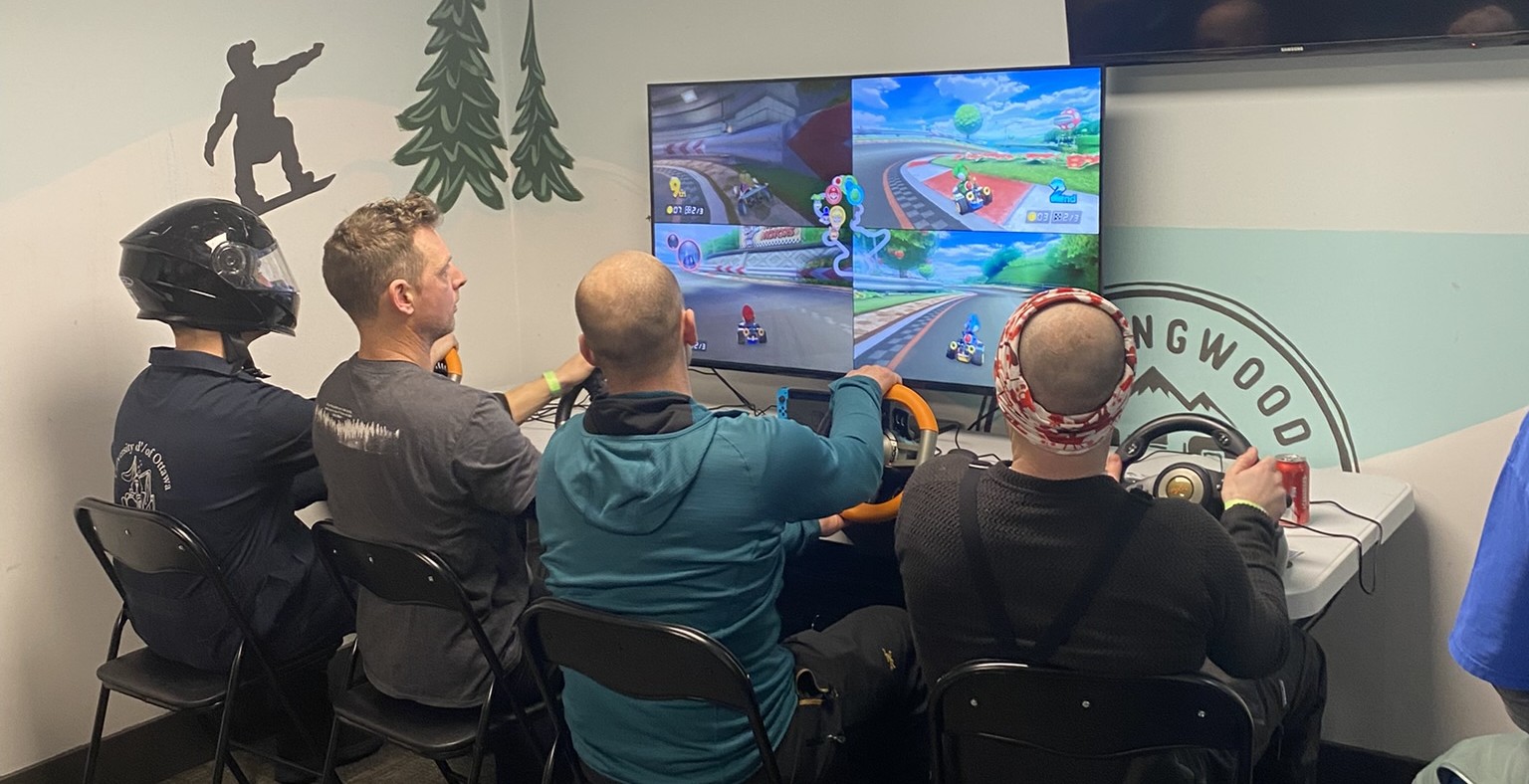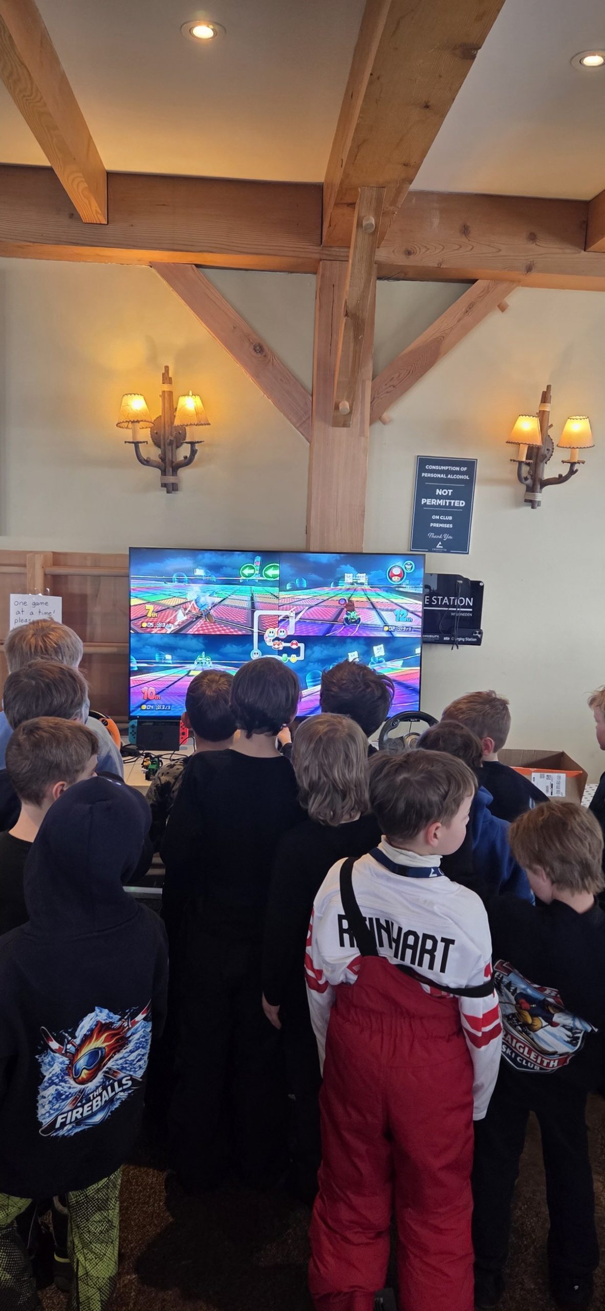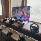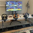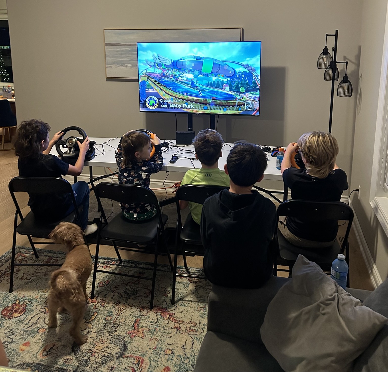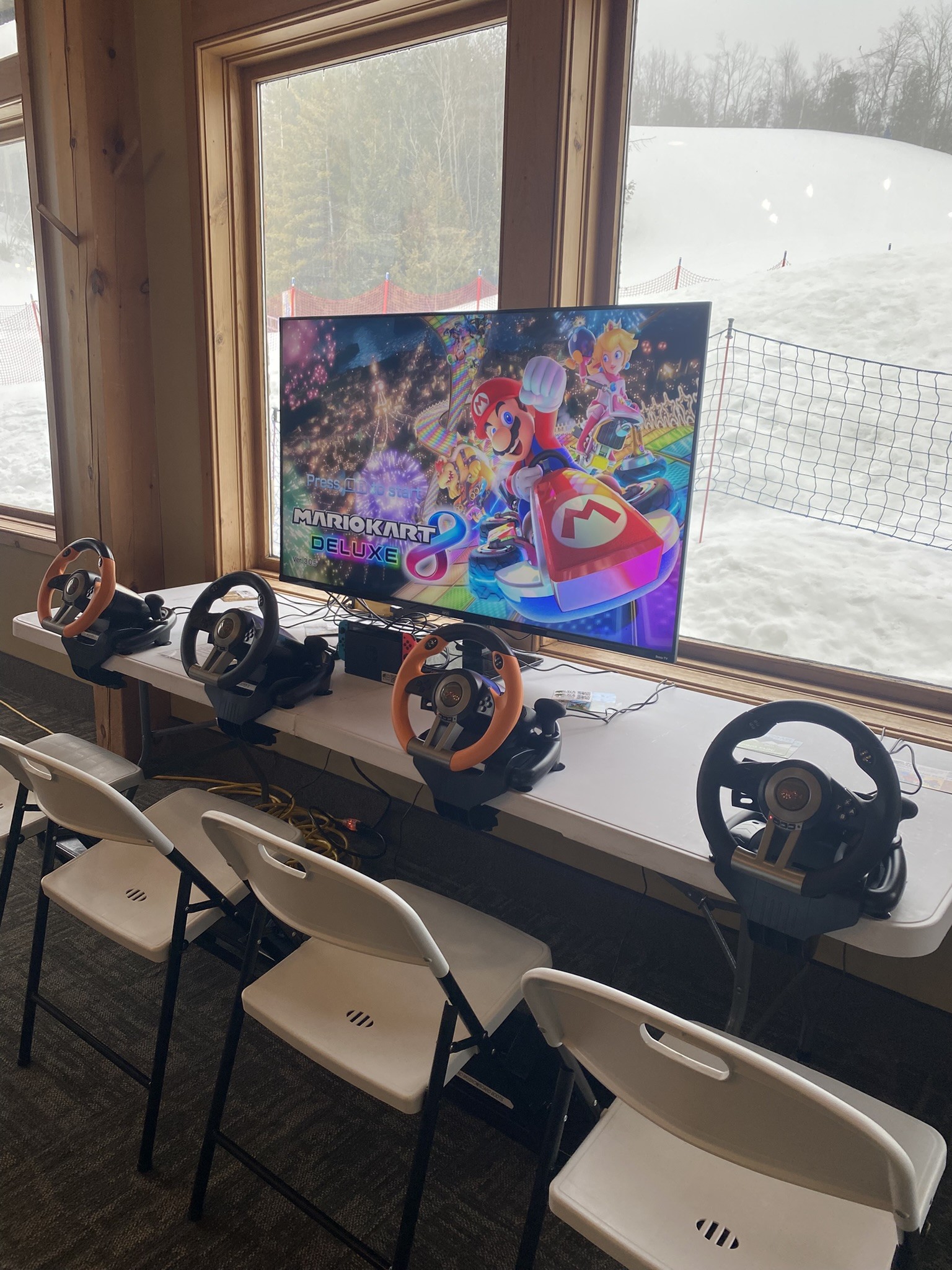 4 Players with all your favourite characters to choose from.  Comes with 55″ Screen TV with stand, Nintendo Switch, 4 steering wheels and pedals, table and 4 chairs.