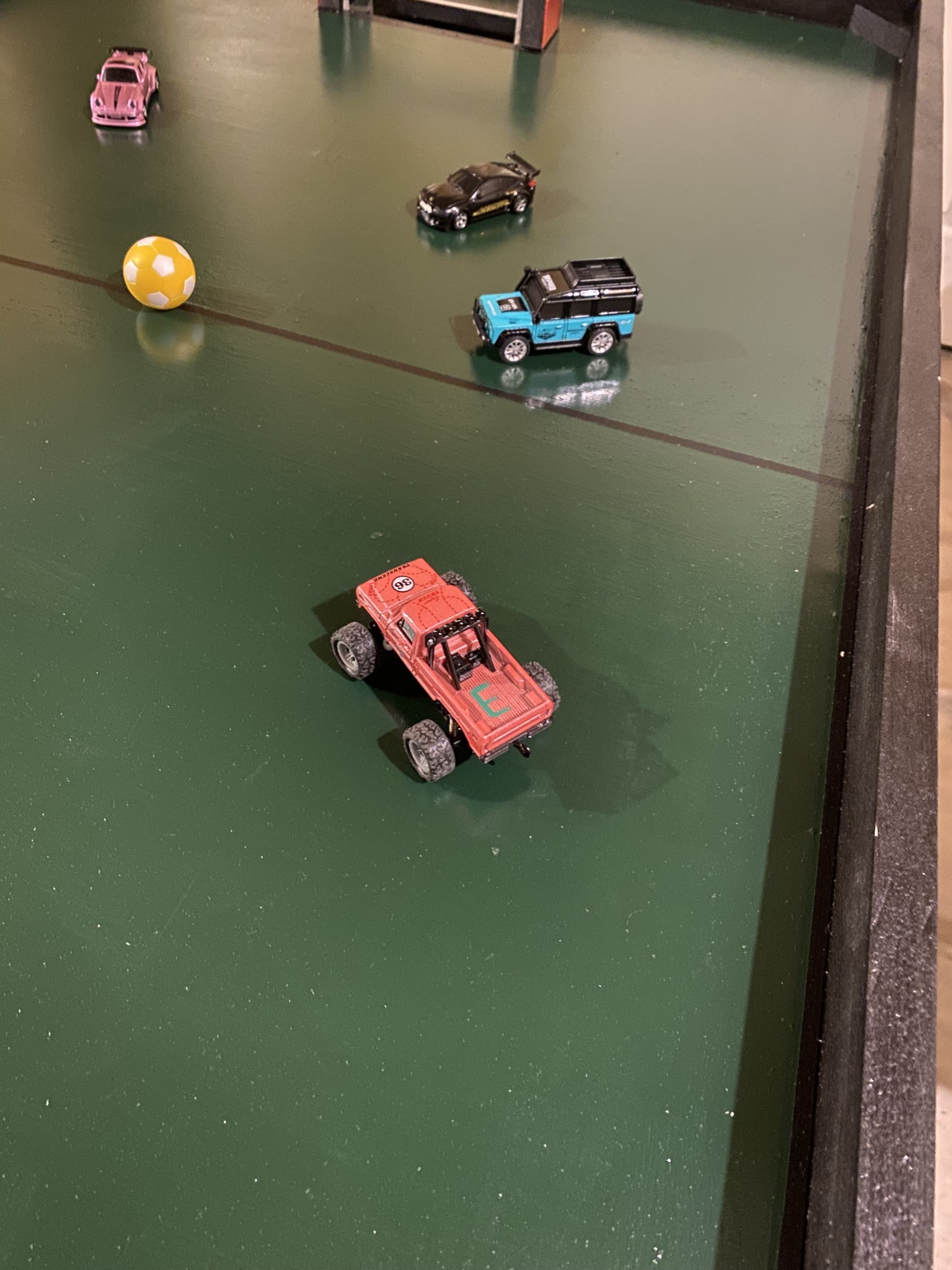 Real life Rocket League. Like the video game but now with your choice of 18 different cars or trucks. All vehicles are 1:64 size, so the same size as a small Hot Wheels car.
